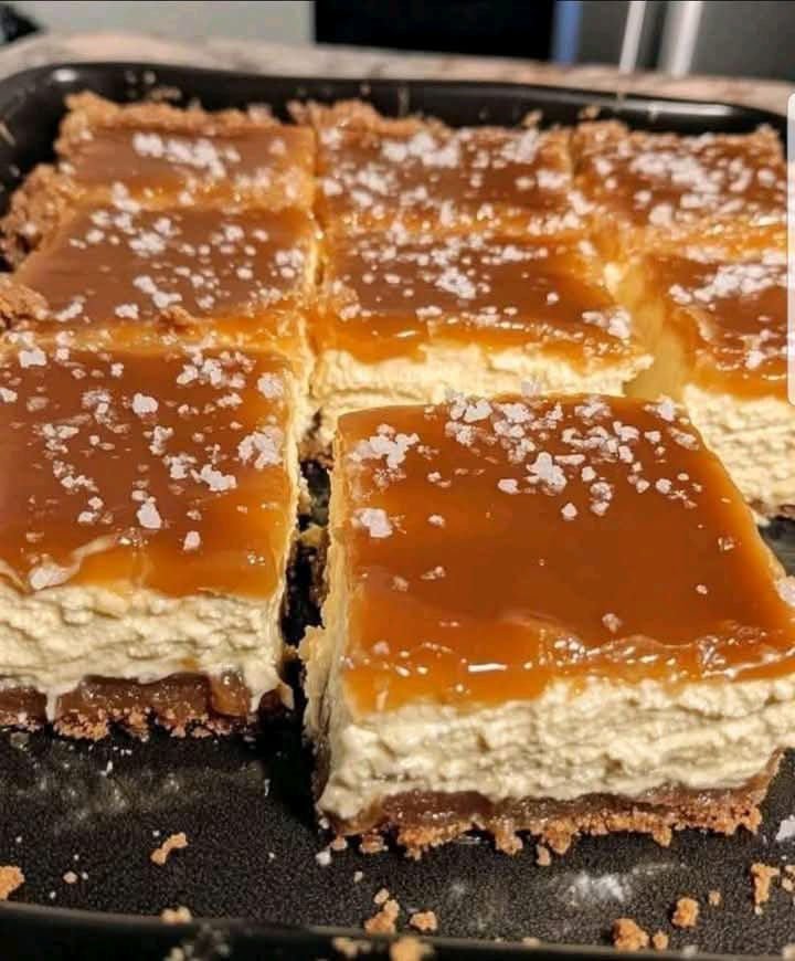 Pour the cooled caramel over chilled cheesecake bars. Refrigerate 15 minutes more to set the topping. Slice into bars and enjoy!